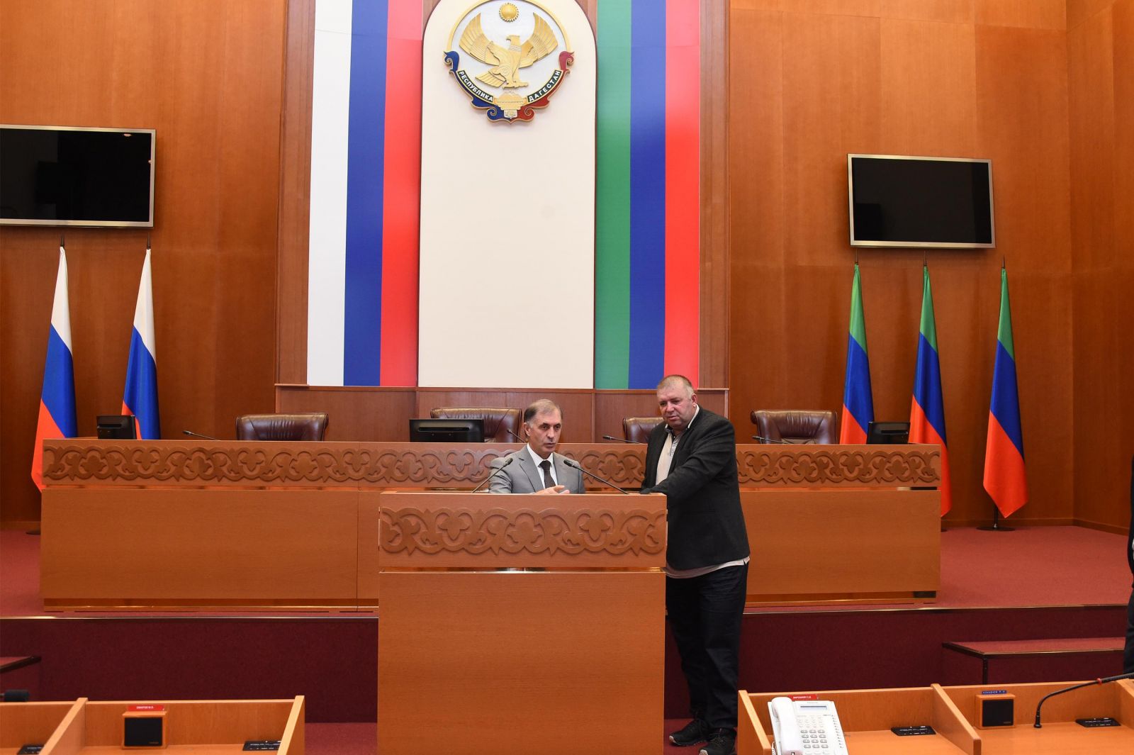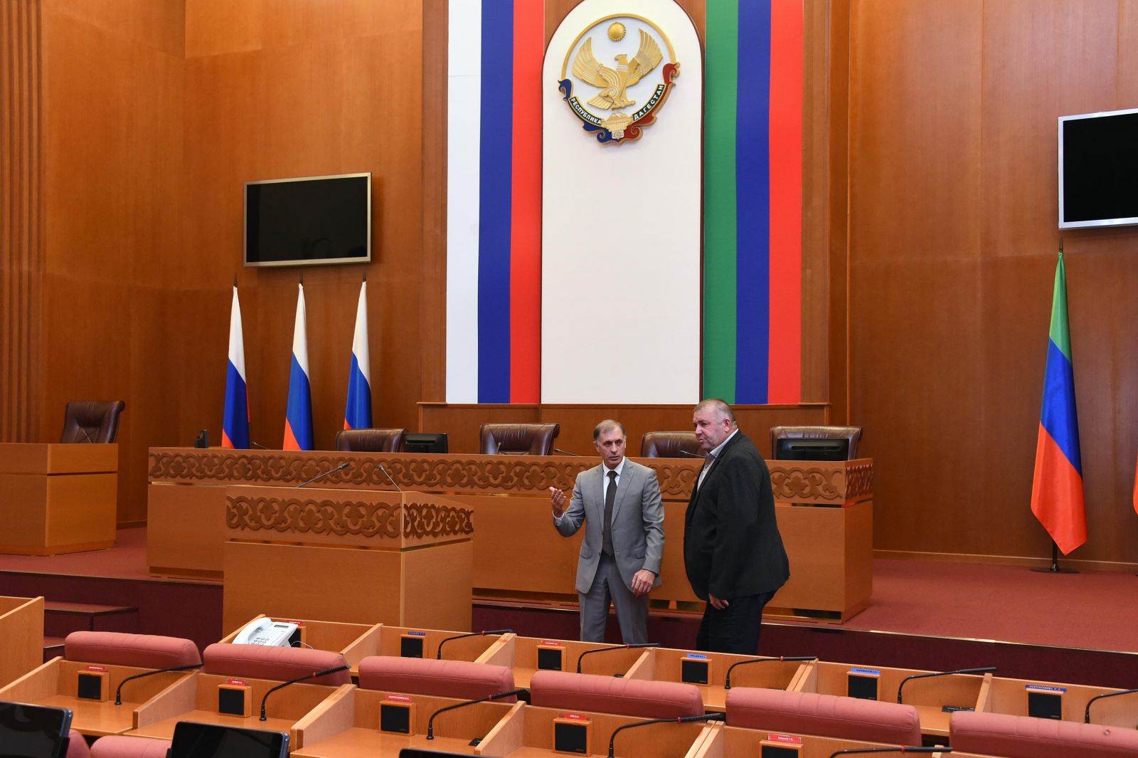 Камил Давдиев провел экскурсию по залам заседаний, объяснил порядок разработки и принятия законопроектов, а также регламент проведения сессий Народного Собрания РД.