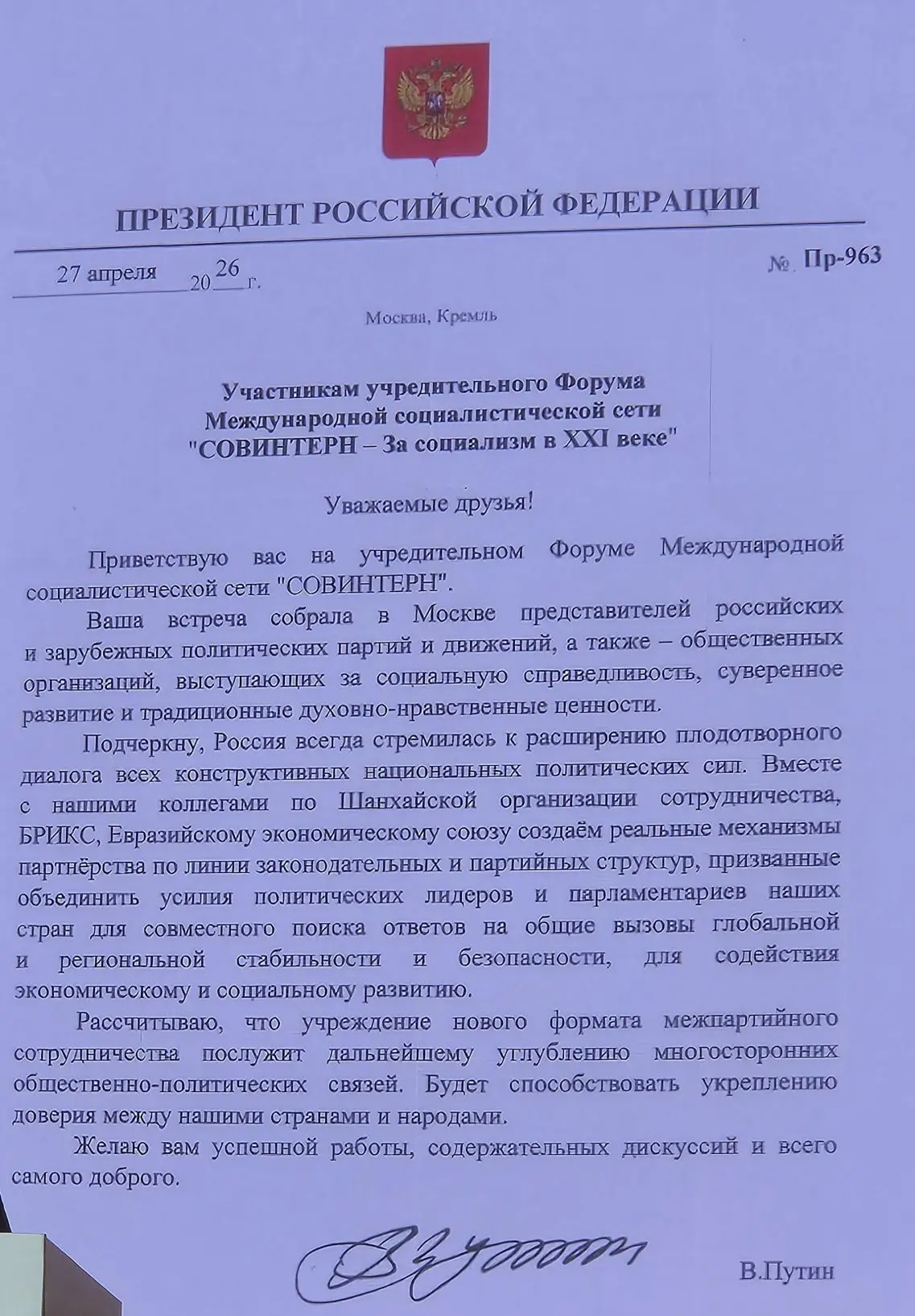 Приветствие участникам Форума направил Президент России В.В. Путин. В своем приветствии Президент отметил: "Ваша встреча собрала в Москве представителей политических партий и движений, а также общественных организаций, выступающих за социальную справедливость, суверенное развитие и традиционные духовно-нравственные ценности."